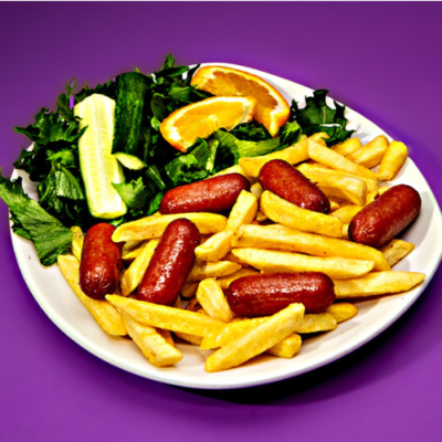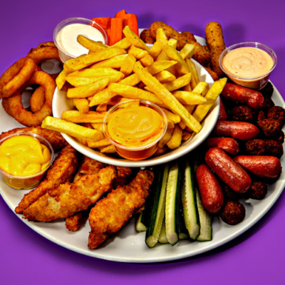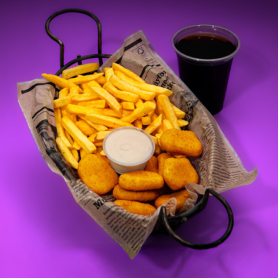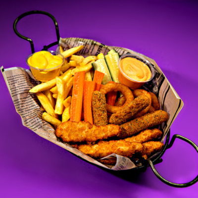Ranskalaiset, 4 x mozzarellatikku, 4 x paneroitu kana, 4 x sipulirengas, kasvistikut, 2 x dippi