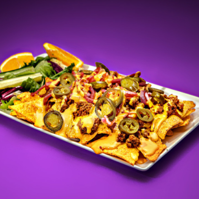 Nachot, tomaattinen jauhelihakastike (naudanliha), cheddarjuustokastike, marinoitu punasipuli, jalapeno, lisukesalaatti