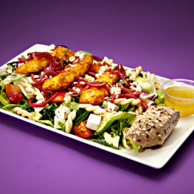(Kana- ja halloumisalaatti saatavilla gluteenittomana, pl. pasta ja patonki